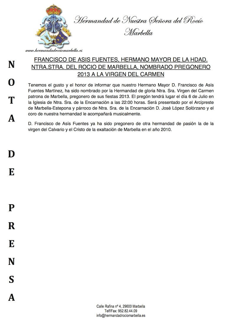 El Hermano Mayor de la Hdad. de Marbella, D. Francisco de Asís Fuentes Martínez, ha sido nombrado por la Hermandad de gloria Ntra. Sra. Virgen del Carmen patrona de Marbella, pregonero de sus fiestas 2013