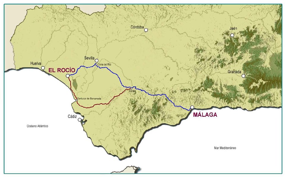 Contempla la posibilidad de hacerlo por los caminos de Sevilla, cruzando el Guadalquivir por Coria del Río, o hacerlo por Sanlúcar de Barrameda recorriendo, en este caso, los caminos de la provincia de Cádiz.