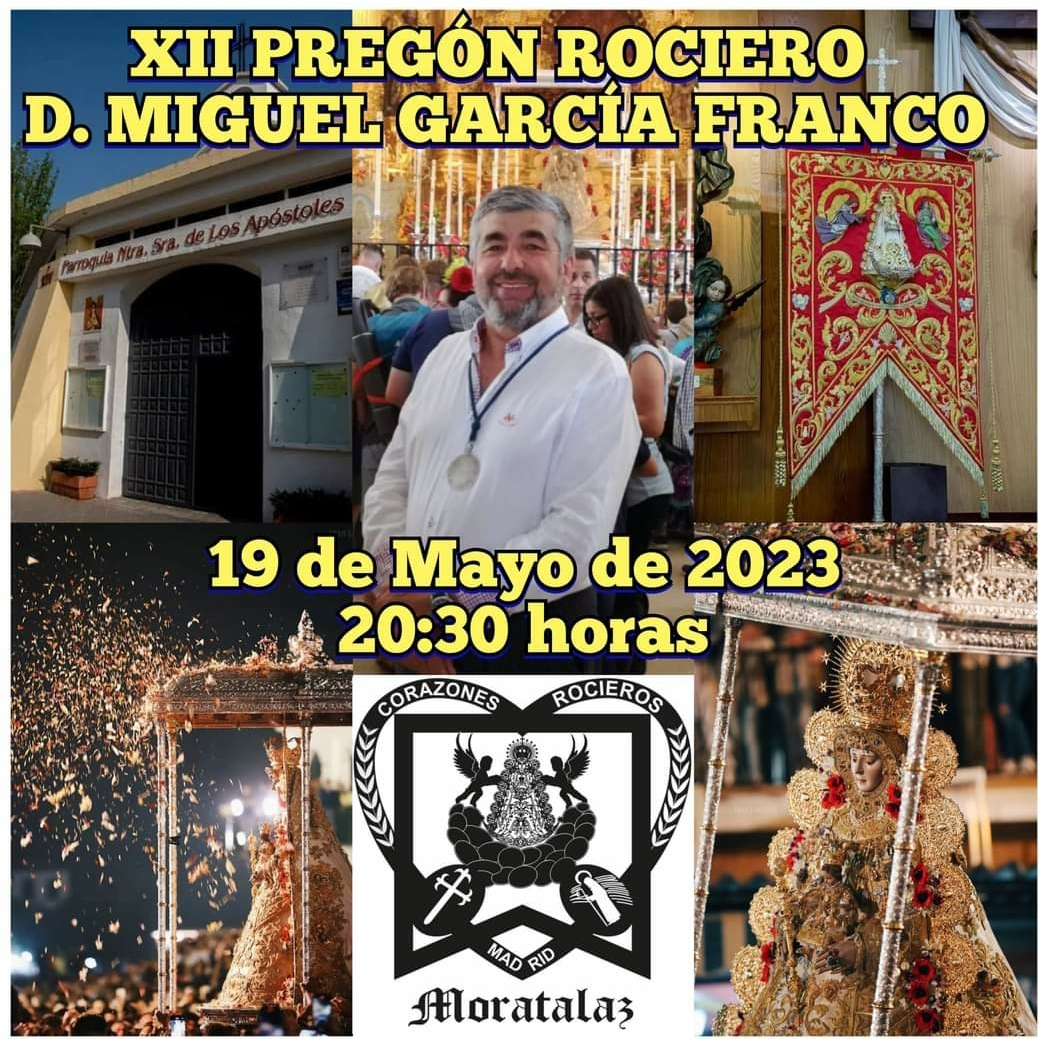 D.Miguel García Franco nacido en Benacazón es hermano de la Vera-Cruz y del Rocío en Benacazón. Cofrade comprometido siente una gran devoción por el Cristo de la Vera-Cruz y por las Vírgenes de los Dolores, de las Nieves y del Rocío.Costalero durante más de 20 años. Vive el Rocío en cualquier época del año y se considera un “Hombre de la Virgen”. Cuenta es su haber con más de 40 Pregones destacando los de Benacazón, Espartinas, Almensilla, Villamanrique de la Condesa, Montequinto, Antequera, Bormujos, Olivares, Tomares, Las Cabezas de San Juan, Umbrete, Chucena, Cerro del Águila, Almería, La Isla de San Fernando, Las Palmas de Gran Canaria, Aznalcazar, Valencia, Santiponce, Mairena del Aljarafe, Valencina de la Concepción, Huevar del Aljarafe, Salteras, Albaida del Aljarafe, Virgen de Cuatrovitas, Alicante, Melilla, La Línea de la Concepción, Cornellá de Llobregat, etc….