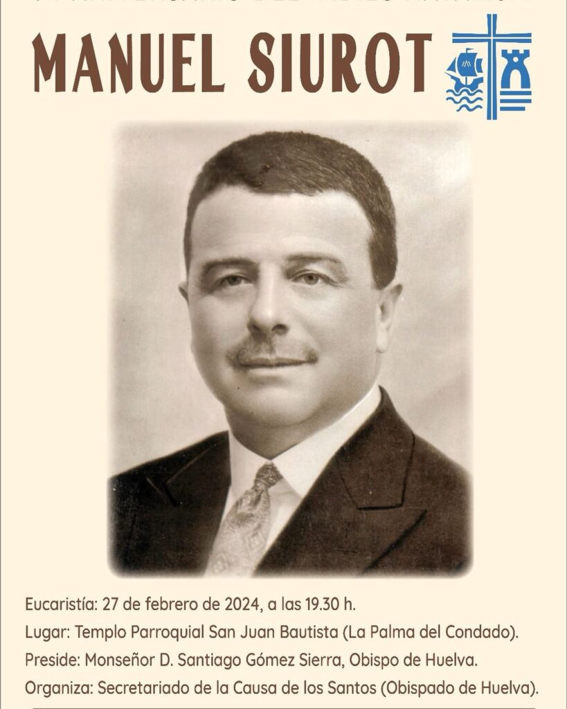 Como ya se ha adelantado, para el próximo martes 27 de febrero de 2024, a las 19.30 horas, el Secretariado de la Causa de los Santos de la Diócesis ha organizado una Eucaristía, en el Templo Parroquial San Juan Bautista de La Palma del Condado, con motivo del 84 aniversario «Dies Natalis» de Manuel Siurot, que será presidida por el Sr. Obispo de Huelva, monseñor Santiago Gómez Sierra.
