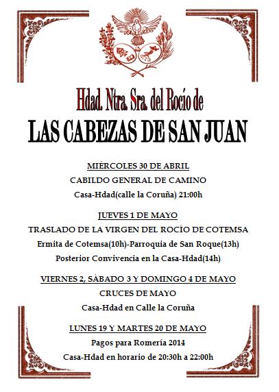 Una vez comenzado el tiempo de Gloria tras la Semana Santa, la Hdad del Rocio de Las Cabezas de San Juan empieza a llevar a cabo actos preparatorios para la Romeria de Pentecostés 2014.