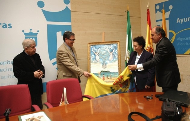 El alcalde, José Ignacio Landaluce, y el hermano mayor de la Hermandad de Nuestra Señora del Rocío de Algeciras, Juan Manuel Gómez, han presentado el pasado 21 de abril, en el Ayuntamiento el cartel que anuncia la peregrinación que los romeros de la ciudad realizarán a tierras almonteñas el próximo mes de mayo, obra de Ana Isabel Zea Belmonte, que también ha estado presente en la convocatoria, a la que igualmente han asistido el delegado diocesano para Hermandades y Cofradías y director espiritual de los romeros algecireños, reverendo Sebastián Llanes Blanco, y el primer teniente de alcalde, Jacinto Muñoz Madrid.