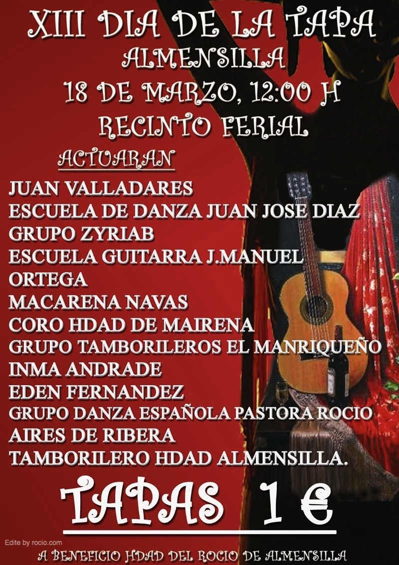 El próximo domingo 18 de marzo, la Hermandad del Rocío de Almensilla organiza el XIII Día de la Tapa. A partir de las 12 del mediodía en el recinto ferial del municipio, se podrá disfrutar de un día de convivencia con tapas a precios populares y entrada gratuita.