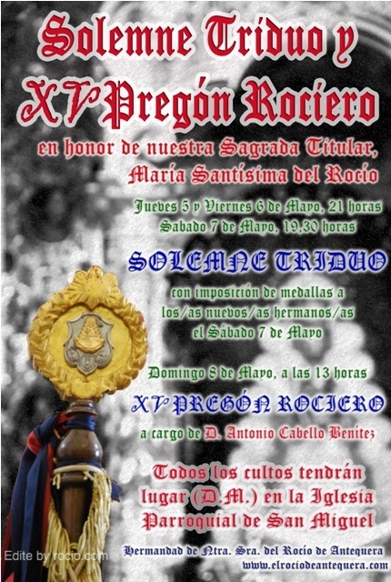 Finalizado el Triduo de la Hdad. tendrá lugar mañana domingo día 8 a las 13 h. el XV Pregón Rociero que correrá a cargo de D. Antonio Cabello Benítez. Todos los actos tendrán lugar en la Iglesia Parroquial de San Miguel.