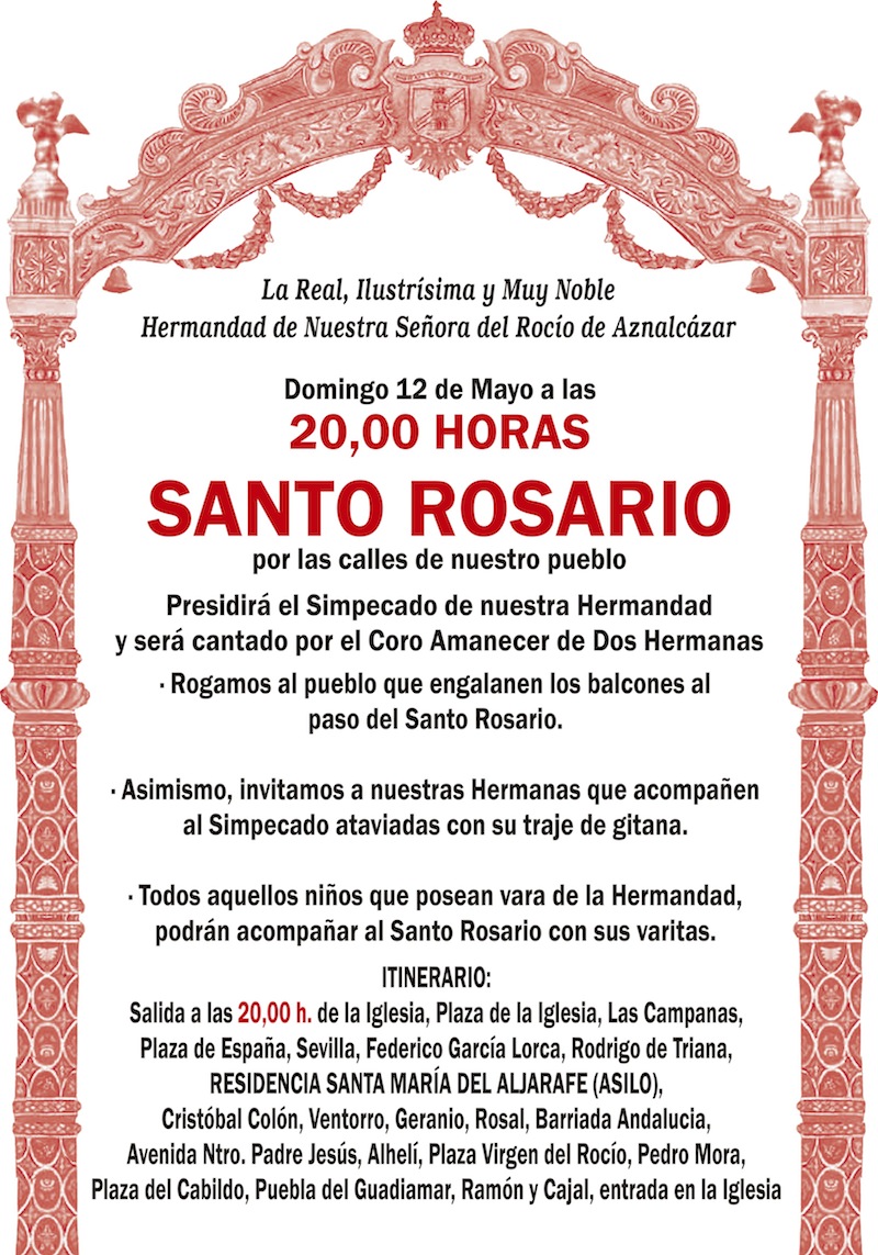 SANTO ROSARIO por las calles de nuestro pueblo. Presidirá el SIMPECADO DE NTRA. HERMANDAD será cantado por el «Coro Amanecer» de Dos Hermanas