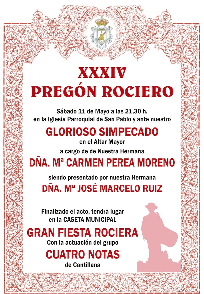 En la Iglesia Parroquial de San Pablo y ante nuestro GLORIOSO SIMPECADO XXXIV PREGON ROCIERO a cargo de Nuestra Hermana Dña. Mª Carmen Perea Moreno siendo presentada por nuestra hermana Dña. Mª José Marcelo Ruiz.