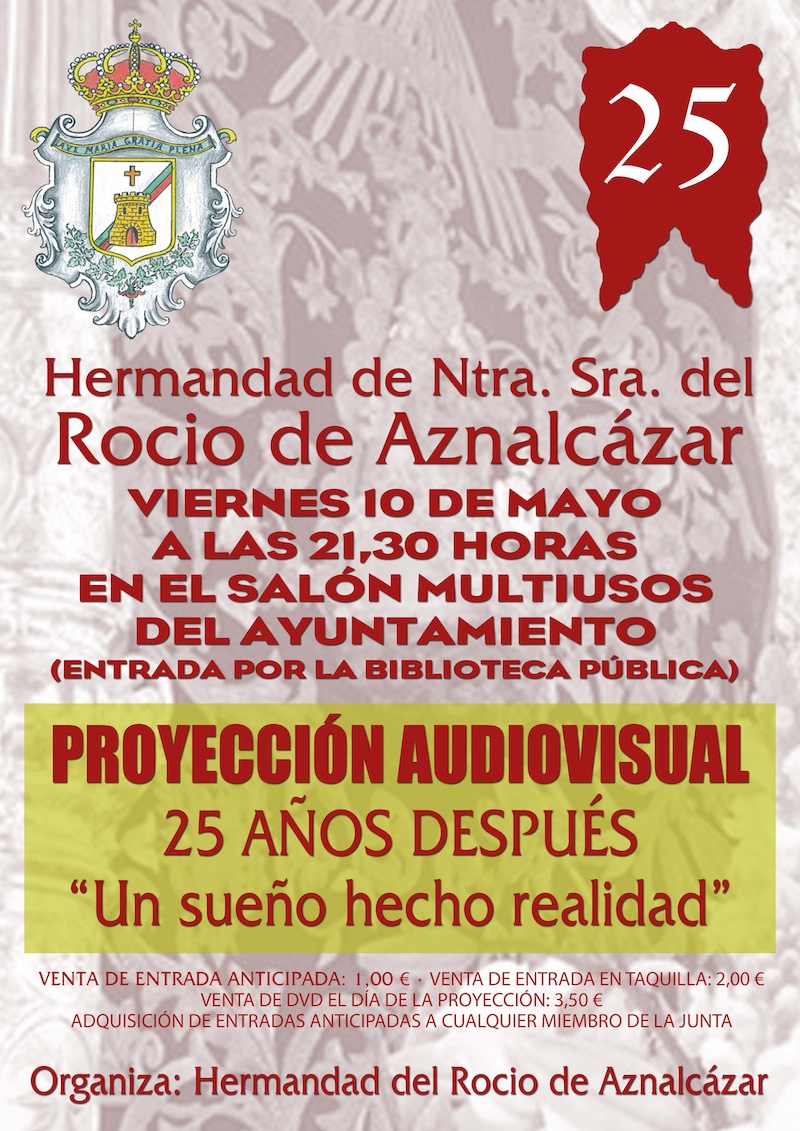 En el Salón Multiusos del Ayuntamiento, proyección del audiovisual «25 AÑOS DESPUÉS, Un sueño hecho realidad» Proyección que contiene el video original de la Bendición del Simpecado. Venta de entrada anticipada a cualquier miembro de la Junta de Gobierno: 1€. Venta el día de la Proyección : 2€