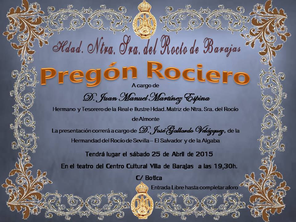XV PREGÓN ROCIERO DE LA HERMANDAD DEL ROCÍO DE BARAJAS. 25 DE ABRIL A LAS 19,30h