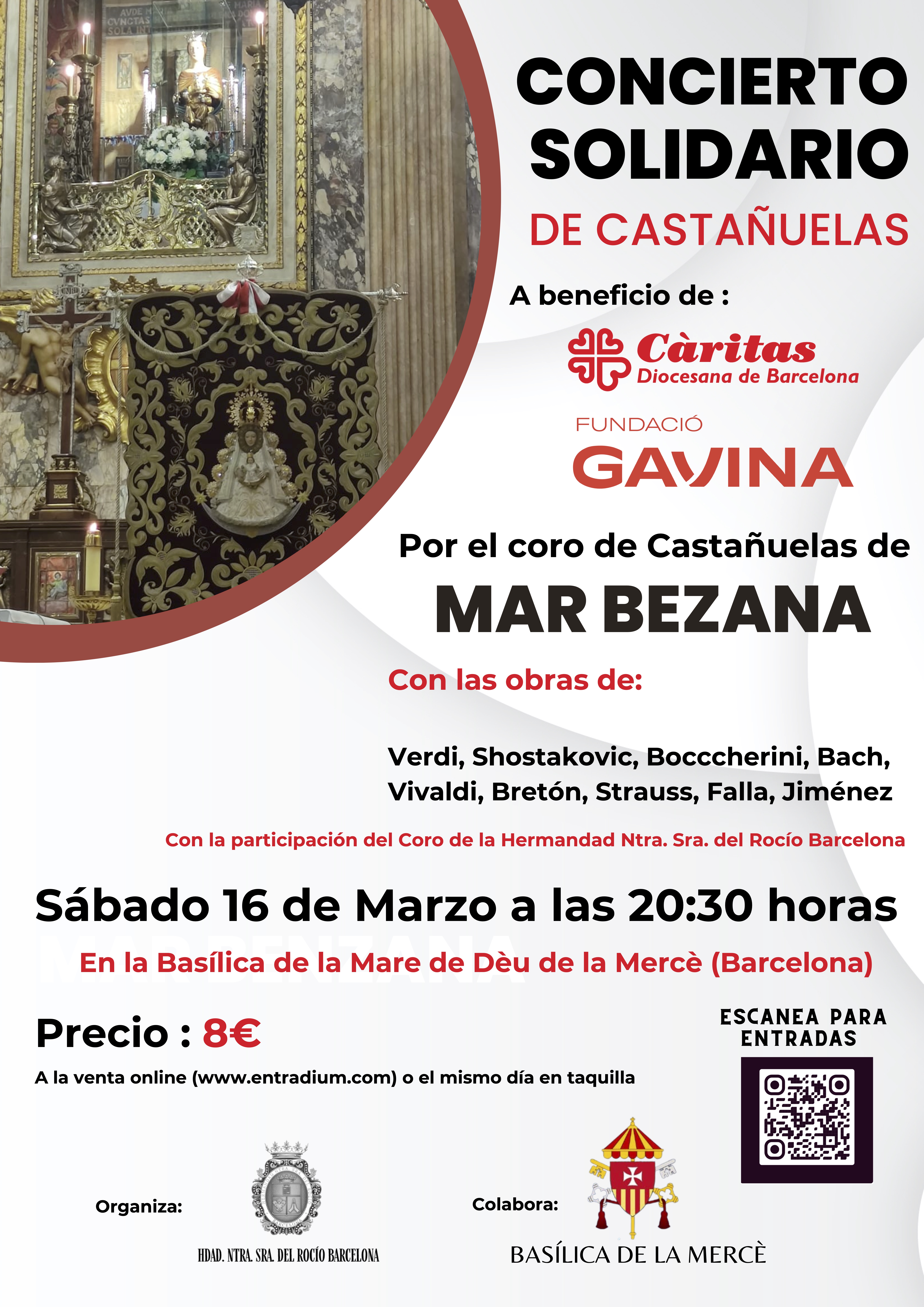 La Diputación de Obras Asistenciales de la Hdad.Ntra.Sra. del Rocío de Barcelona organiza, con la colaboración de la Basílica de la Mercè de Barcelona, el Concierto Solidario de Castañuelas a beneficio de Càritas Barcelona y de Fundació Joan Salvador Gavina. Será el sábado 16 de marzo a las 20.30 horas en la Basílica de la Mercè (Plaza de la Mercè 1. Barcelona) a cargo del coro de Castañuelas de Mar Bezana.