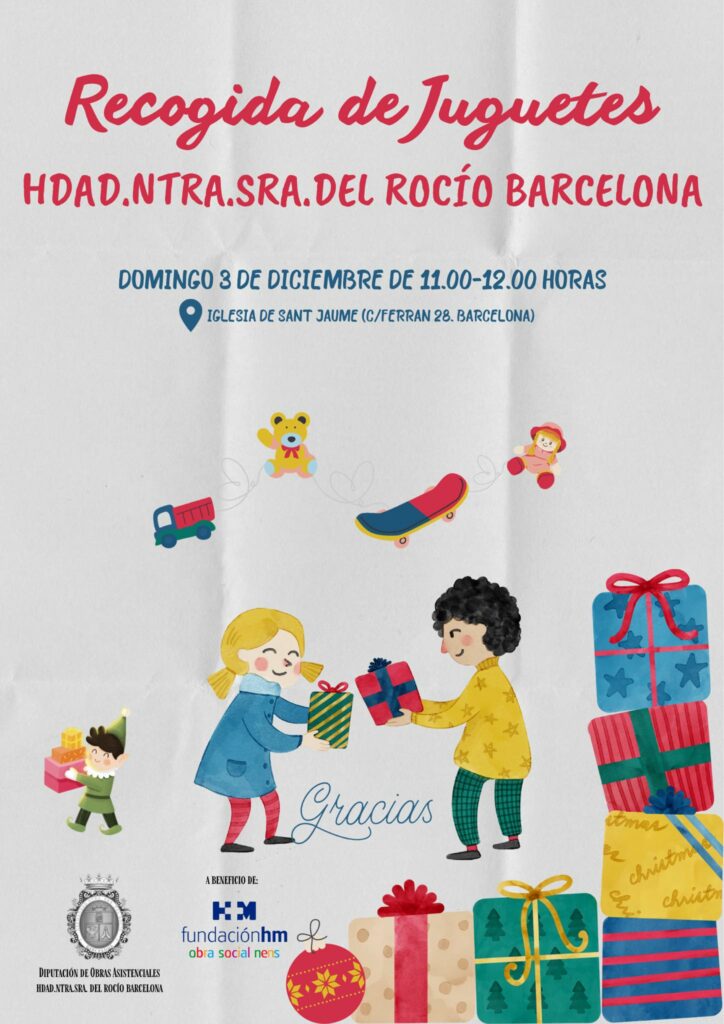 Este domingo 3 de diciembre de 11.00 a 12.00 horas, la diputación de Obras Asistenciales de nuestra Hermandad, realiza una recogida de juguetes nuevos a estrenar en la Iglesia de Sant Jaume para los niños del Hospital HM Nens . Hagamos que la sonrisa de un niño se dibuje con nuestra solidaridad. #hdarociobarcelona