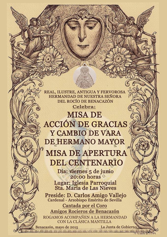 El próximo viernes, día 5 de junio, la Hermandad del Rocío de Benacazón celebra su misa, presidida por Don Carlos Amigo Vallejo, de Acción de Gracias y Cambio de Varas del Hermano Mayor.
