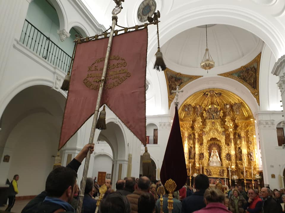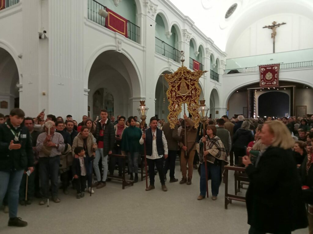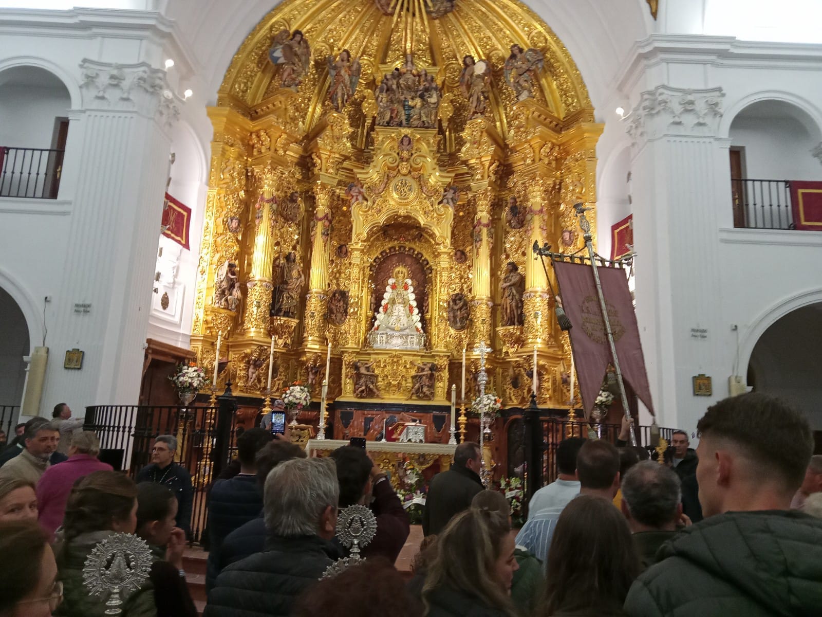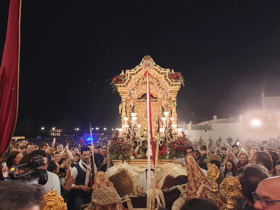 En su 75 aniversario, la Hermandad del Rocío de Bollullos de la Mitación han realizado su peregrinación extraordinaria anual hasta las plantas de la Virgen del Rocío con su carreta. Postrándose a las plantas de la Virgen minutos antes de iniciarse el rezo del Rosario.
