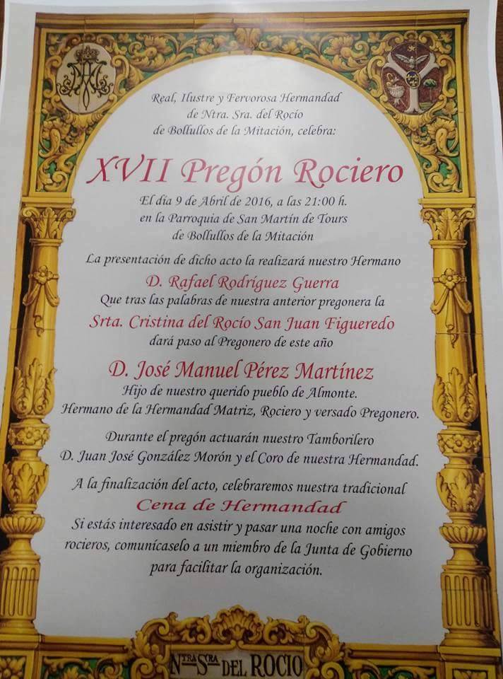 Hermandad de Bollullos de la Mitación – XVII Pregón Rociero a cargo de José Manuel Pérez Martínez.