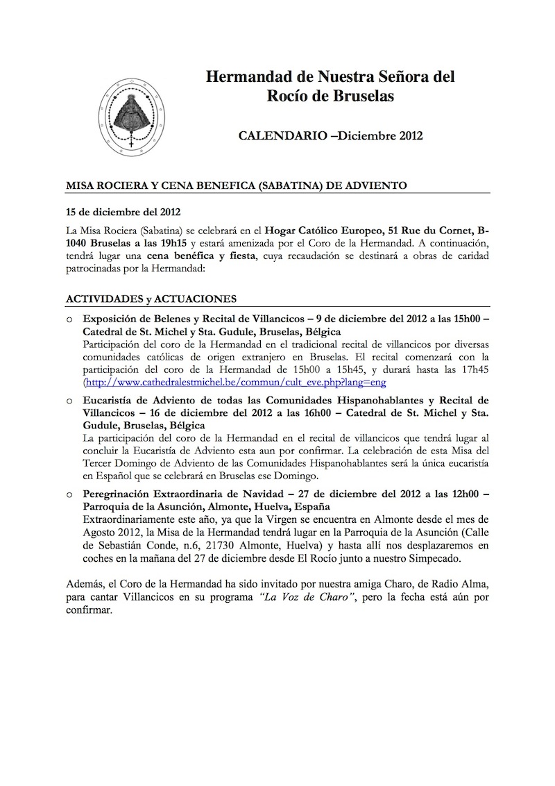 Este mes de Diciembre esta repletito de actividades y actuaciones para nuestra Hermandad y su Coro, como podéis ver en el documento adjunto.
