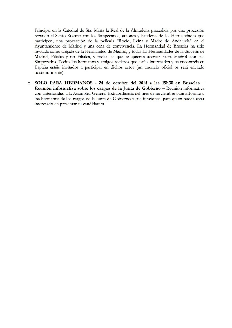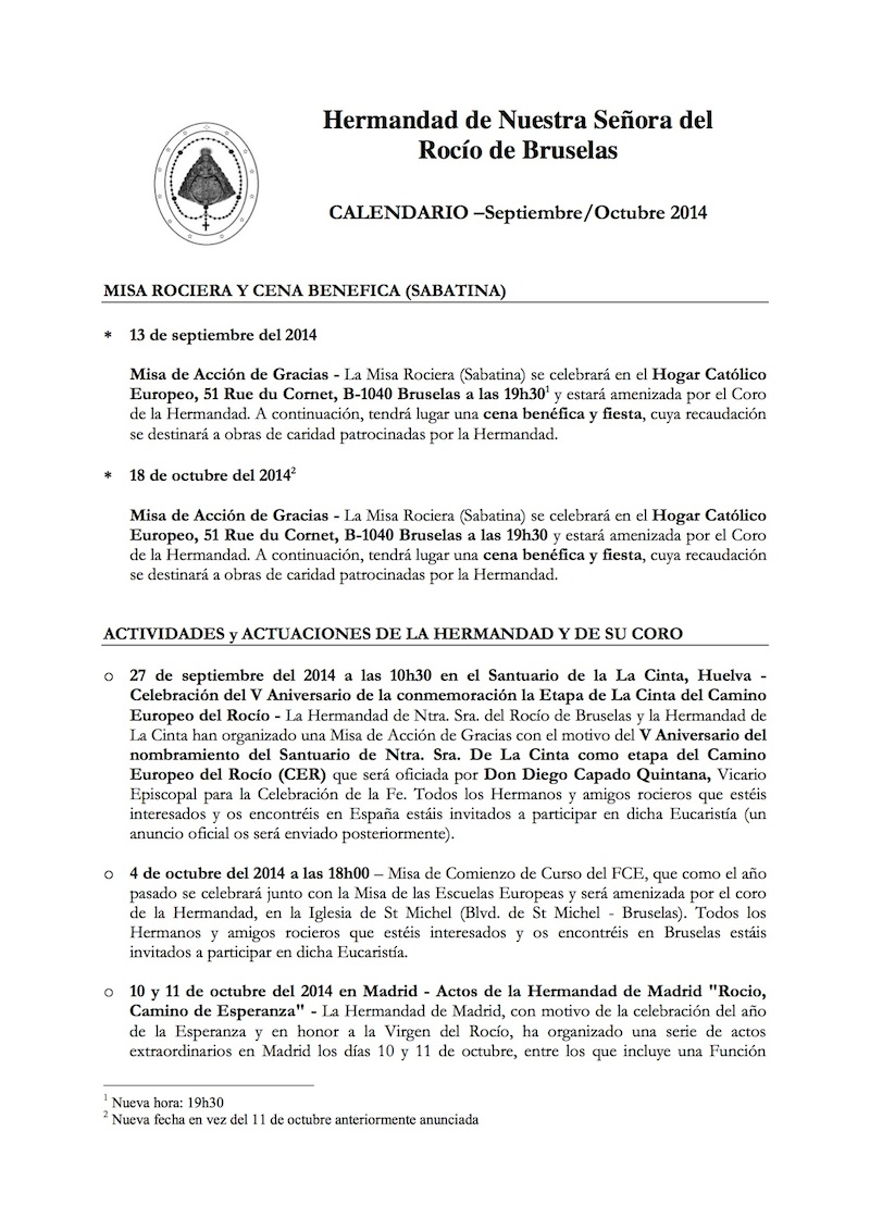 Calendario de actividades de la Hermandad confirmadas hasta la fecha para los meses de Septiembre y Octubre del 2014.