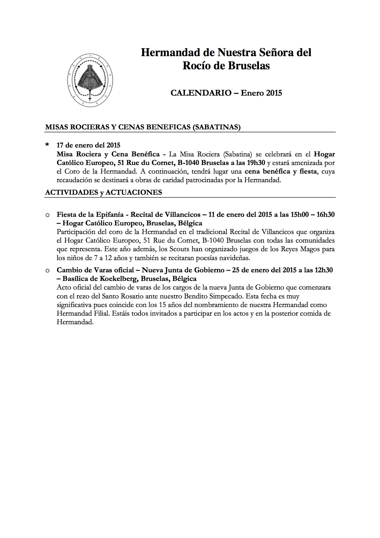 La Hermandad de Bruselas nos remite la Agenda rociera del mes de enero así como el calendario de sabatinas de enero a junio 2015.