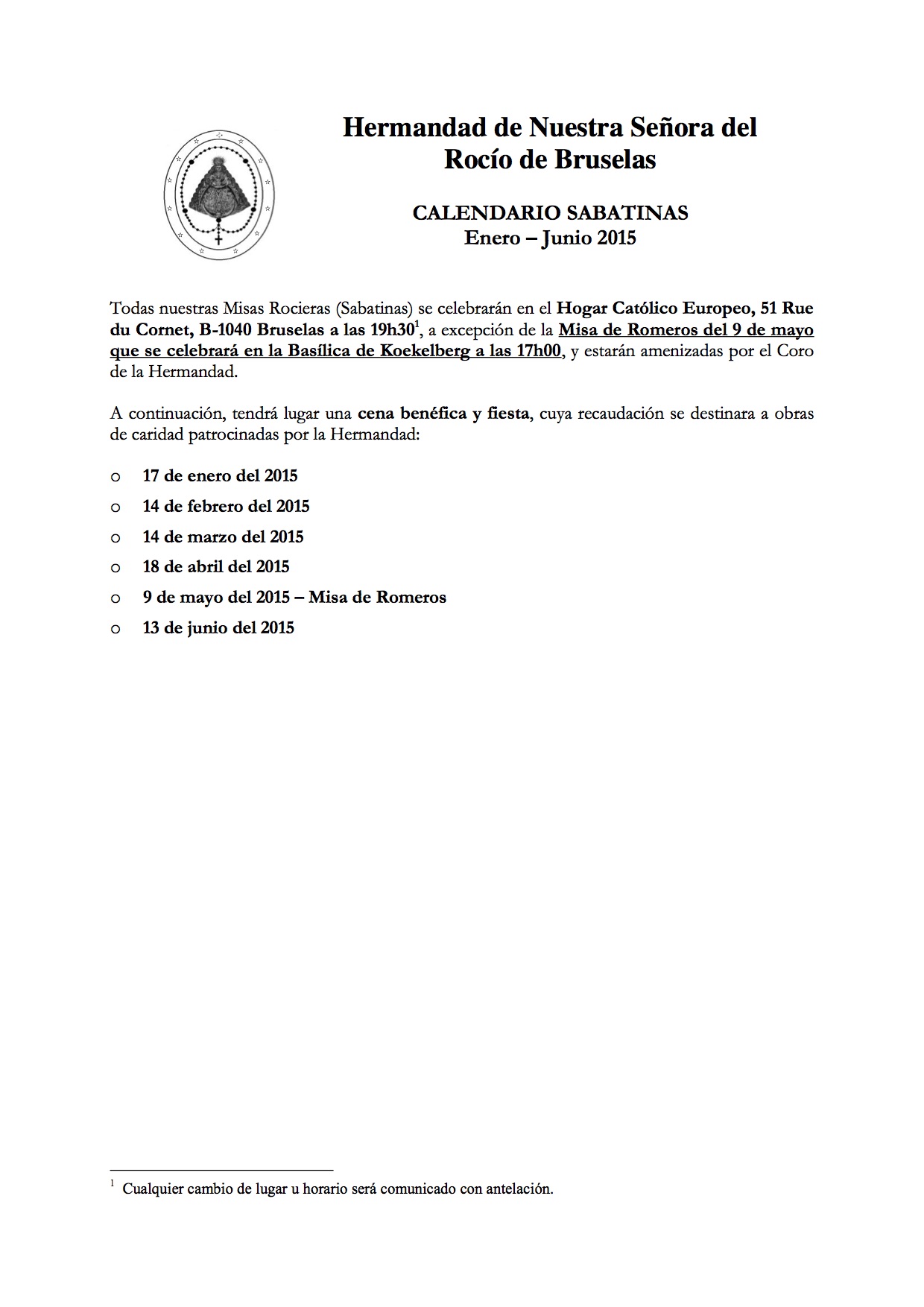 Hermandad de Bruselas Agenda de Enero 2015 y SABATINAS de Enero – Junio 2015