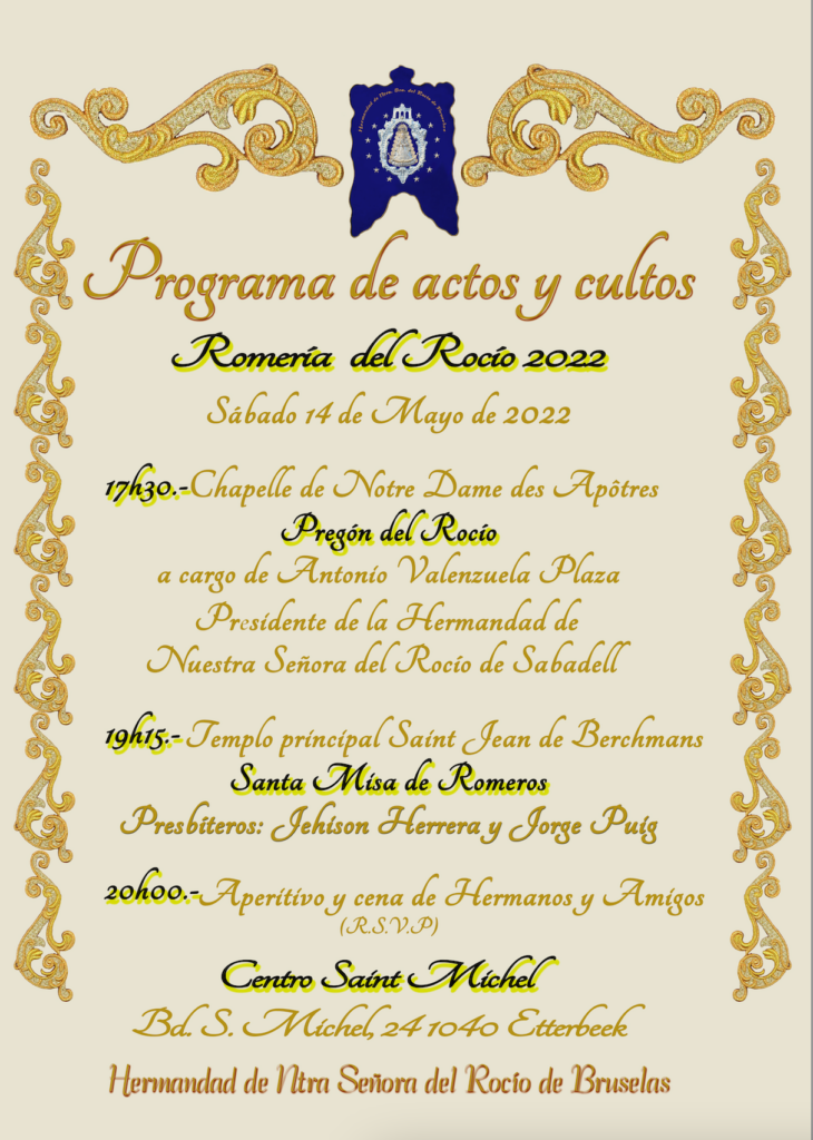 17.30 h Pregón a María Santísima del Rocío a cargo de D. Antonio Valenzuela Plaza. Presidente de la Hermandad de Nuestra Señora del Rocío de Sabadell. Chapelle de Notre Dame des Apôtres (es la capilla lateral de la iglesia del Collège Saint Michel).