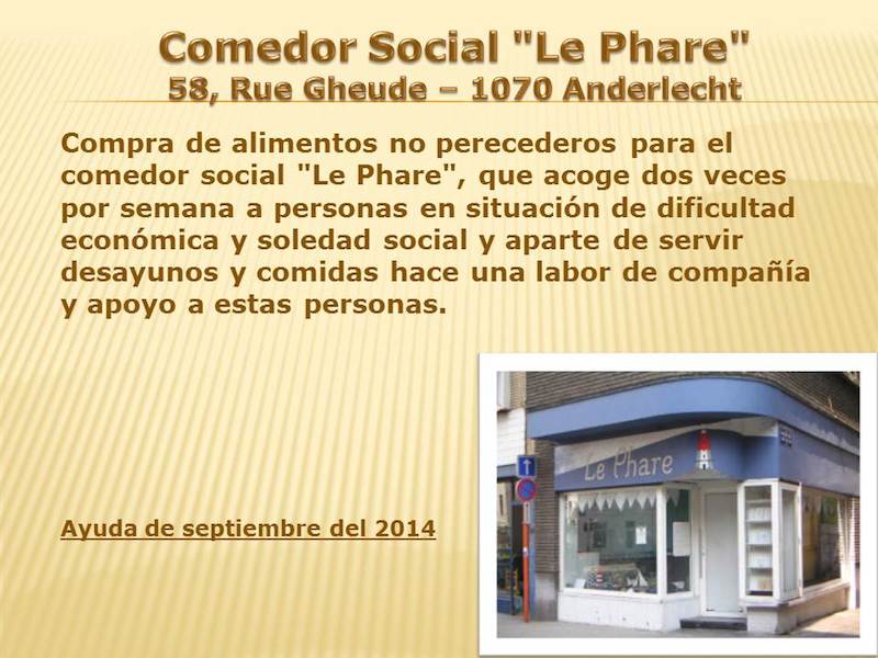 "Le Phare" es un pequeño comedor social, que acoge a unas 20-25 personas un par de veces por semana y les ofrece desayunos y comidas. Aparte de esta ayuda, los voluntarios de "Le Phare" hacen una labor social de acompañamiento y conversación que a veces es mucho más valiosa que el aporte alimenticio.