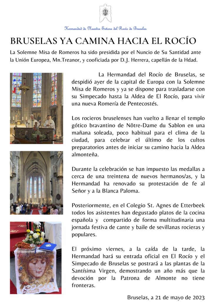 La Hermandad del Rocío de Bruselas, se despidió ayer de la capital de Europa con la Solemne Misa de Romeros y ya se dispone para trasladarse con su Simpecado hasta la Aldea de El Rocío, para vivir una nueva Romería de Pentecostés.