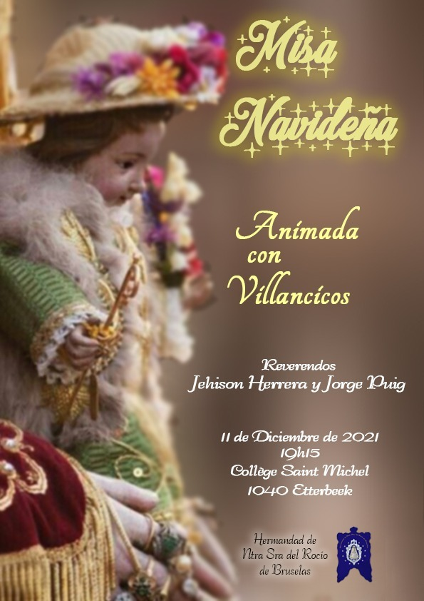 Nuestra Hermandad de Nuestra Señora del Rocío de Bruselas celebrará su tradicional y Solemne Misa sabatina navideña, el próximo sábado 11 de diciembre a las 19.15 en la Iglesia de Saint Michel (los jesuitas de Etterbek a 100 metros de la estación de metro Montgomery). Será oficiada por los Padres don Jehison Herrera y don Jorge Puig. El Coro de la Hermandad con Carmencita y Luismi volverán a animarnos y ahora también con nuestros villancicos de siempre.