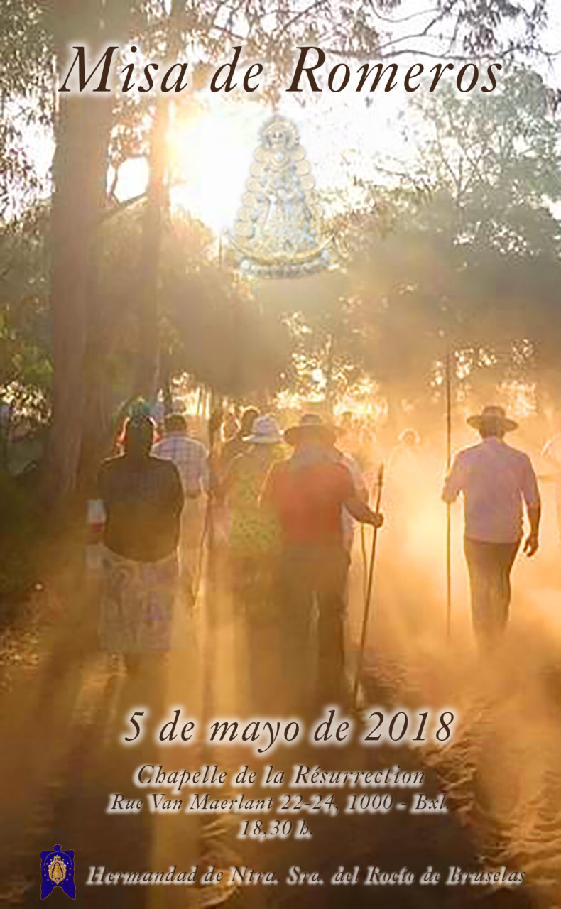 Y para marcar este comienzo de nuestra peregrinación hacia la Aldea del Rocío os anunciamos, con este precioso cartel obra de nuestra hermana Patricia, nuestra Misa de Romeros que se celebrará el sábado 5 de mayo a las 18h30 en la Chapelle de la Résurrection (Rue Van Maerlant 20, Bruselas), delante de nuestro Bendito Simpecado y animada por nuestro querido y admirado Coro Rociero, alma de nuestra Hermandad. Durante la Eucaristía se impondrán las medallas bendecidas a los nuevos hermanos se dará cumplimiento a nuestras reglas renovando nuestros votos.