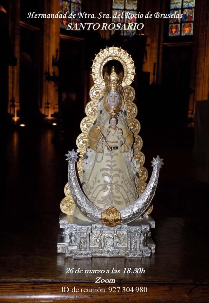 En estas semanas tan especiales que estamos viviendo, desde la Hermandad de Bruselas queremos seguir uniéndonos en torno a nuestra muy amada Virgen del Rocío, que como Santísima Madre nos cuida y nos ampara. Cumpliendo con el «yo me quedo en casa», queremos invitaros a rezar el Santo Rosario una vez a la semana todos juntos, usando los medios virtuales a nuestro alcance.