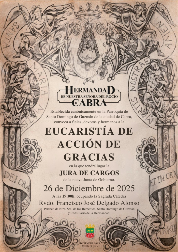 Eucaristía de Acción de Gracias y Jura de Cargos de la nueva Junta de Gobierno, que tendrá lugar el próximo viernes, 26 de diciembre, D. M., a las 19:00 h, en la Parroquia de Santo Domingo de Guzmán.