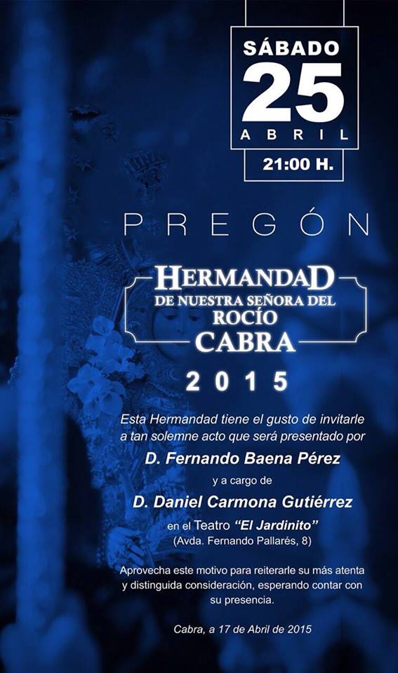 El próximo sábado, 25 de abril de 2015, tendrá lugar en el Teatro El Jardinito (Avda. Fernando Pallarés) el Pregón de la Hermandad de Ntra. Sra. del Rocío de Cabra a cargo de D. Daniel Jesús Carmona Gutiérrez, que será presentado por D. Fernando Baena Pérez. El acto dará comienzo a las 21.00 horas con entrada libre.