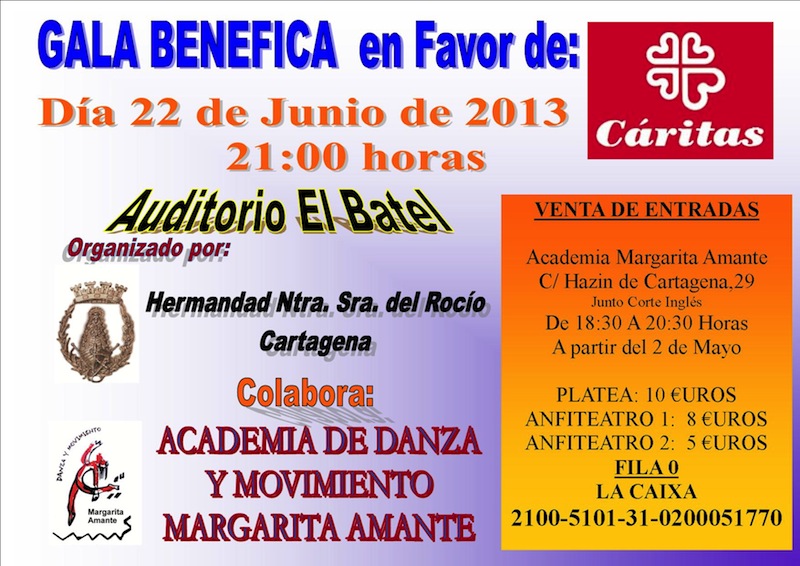 La Hermandad de Ntra. Sra. del Rocío de Cartagena trabaja en la preparación de una Gala de Danza ,Baile Moderno,Flamenco,salsa y contemporáneo con la colaboración de la Academia de Danza y Movimiento de Margarita Amante,cuyos beneficios se destinaran integramente a CARITAS CARTAGENA, para el día 22 de junio e 2013 a las 21:00 horas las entradas están a la venta en la Academia de Margarita Amante en la Calle Hazin de Cartagena nº 29 junto al corte ingles,también se puede colaborar con una aportación en la fila 0.sean solidarios con las personas menos favorecidas por la sociedad