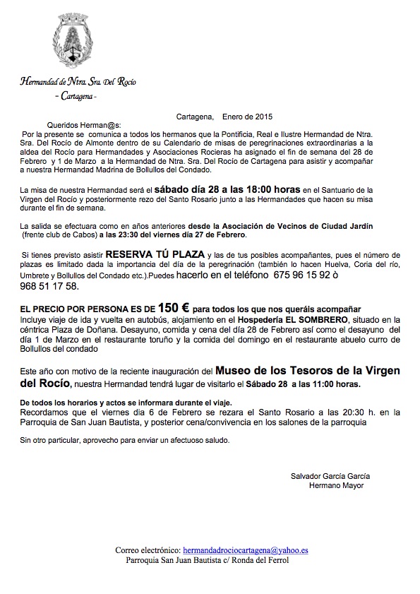 La misa de nuestra Hermandad será el sábado día 28 a las 18:00 horas en el Santuario de la Virgen del Rocío y posteriormente rezo del Santo Rosario junto a las Hermandades que hacen su misa durante el fin de semana.