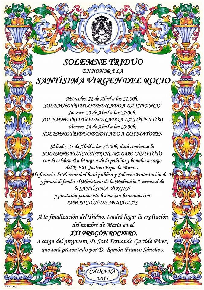 La Hermandad de Ntra. Sra. del Rocío de Chucena realizará su tradicional Triduo los días 22, 23 y 24 de Abril y el Sábado día 25 la Función Principal y el XXI Pregón Rociero.