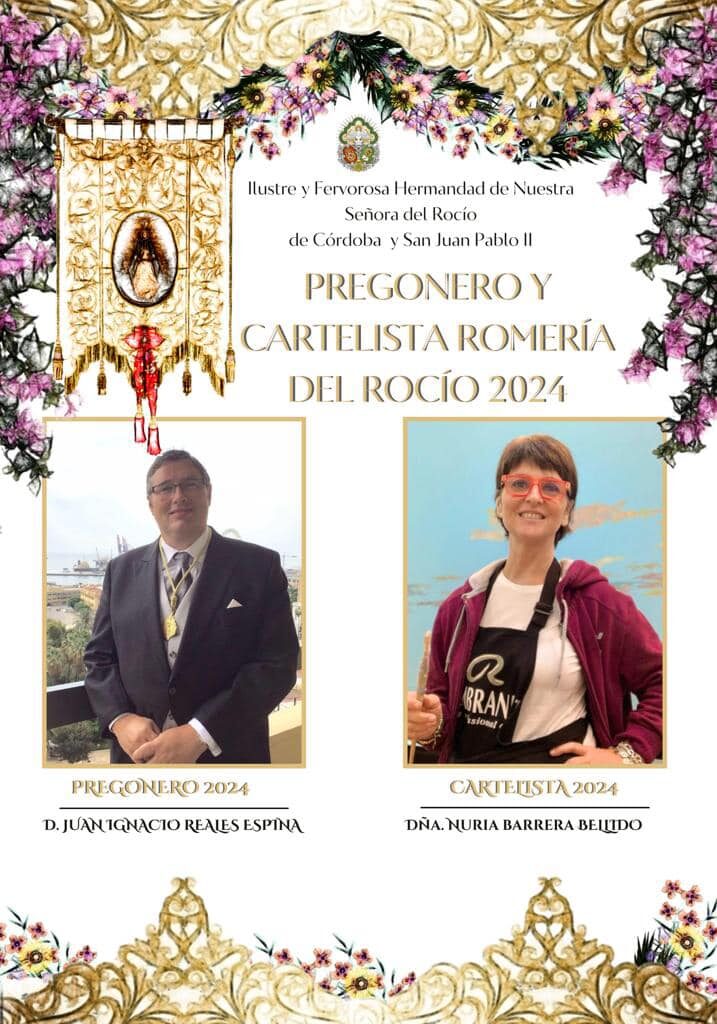 a Junta de Gobierno de la Ilustre y Fervorosa Hermandad Nuestra Señora del Rocío de Córdoba y San Juan Pablo II, reunida en Cabildo de Oficiales ha designado como Pregonero de la Romería de 2024 a D. Juan Ignacio Reales Espina. También ha sido designada como cartelista para la Romería del Rocío de 2024 a Dña. Nuria Barrera Bellido.