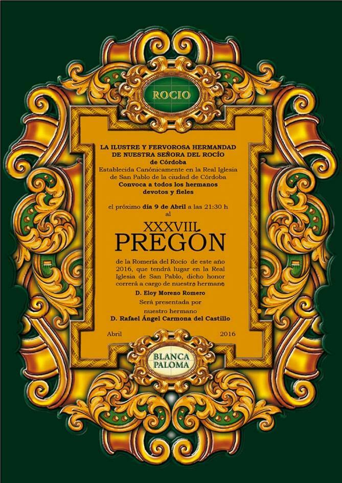 La Hermandad de Córdoba celebra su XXXVIII Pregón Rociero a cargo de Eloy Moreno Romero el próximo 9 de abril de 2016.