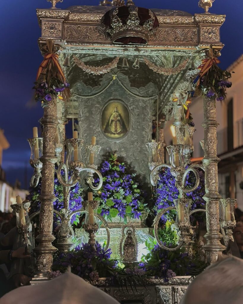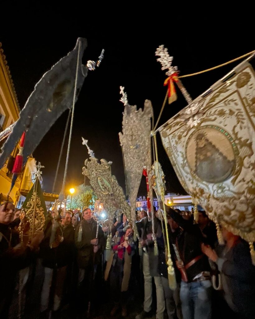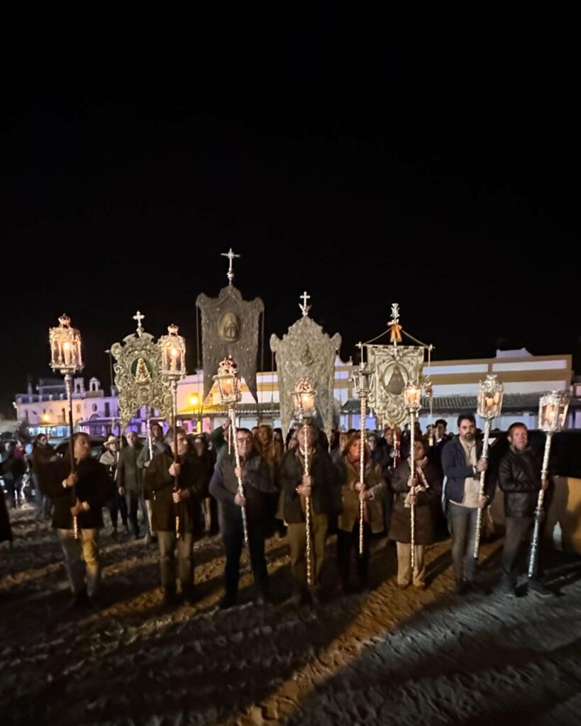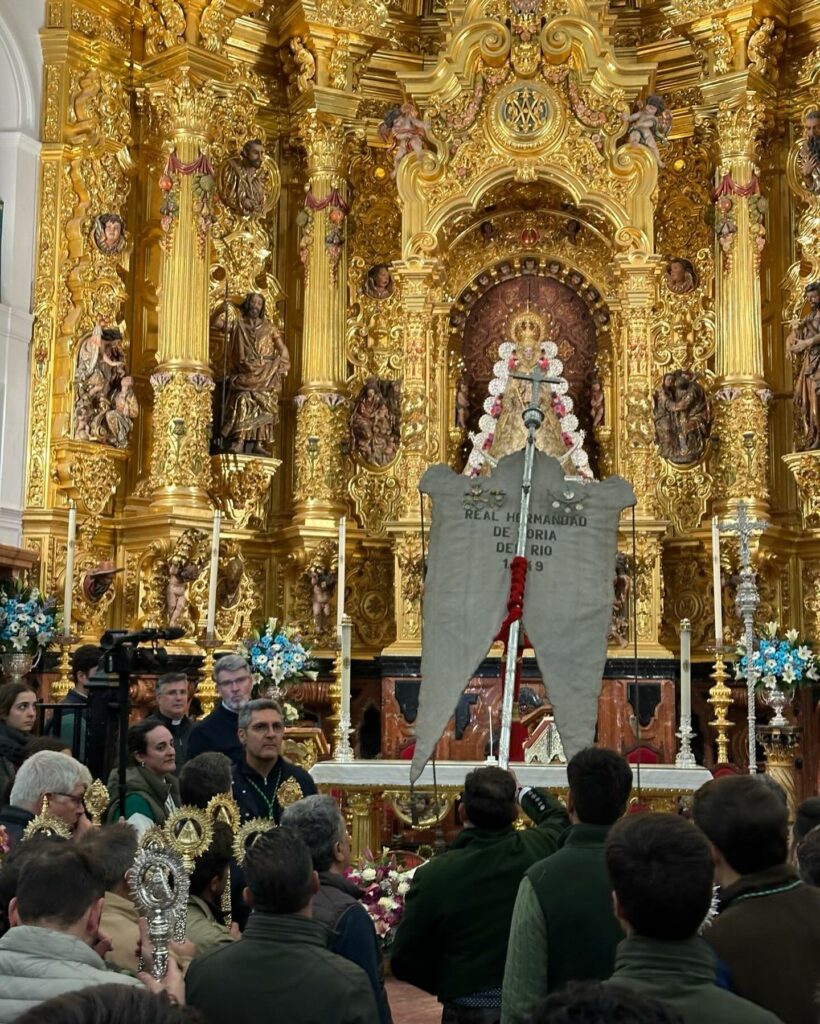 Dentro de su amplio programa conmemorativo del 175 aniversario fundacional, la Hermandad de Ntra. Sra. del Rocío de Coria del Río ha peregrinado hoy con su carreta portasimpecado desde Hato Blanco hasta la aldea del Rocío. A la puerta del Santuario del Rocío le esperaba una representación de la Hermandad Matriz de Almonte, madrina de la Hermandad Coriana, como lo atestigua el acta levantada el día 20 de mayo de 1849, por el secretario de la nueva Hermandad, en “campo de la Rosina, en término de la villa de Almonte”.