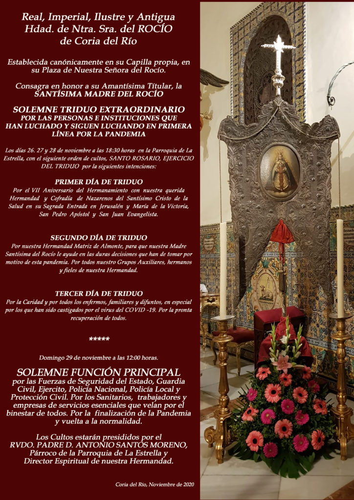 La Real, Imperial, Ilustre y Antigua Hermandad de Nuestra Señora del Rocío de Coria del Río, celebra Solemne Triduo Extraordinario a María Santísima del Rocío, del 26 al 28 de noviembre a las 18:30 horas y Función Principal prevista para el domingo 29 a las 12:00 horas. Los cultos serán en la Parroquia de Sta. María de La Estrella.