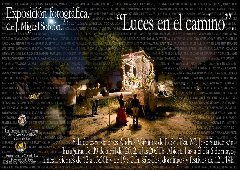 Tras dos años de trabajo y de meses de selección de fotografías, el próximo 19 de abril se inaugurara en la sala de exposiciones Andrés Martínez de León de Coria del Río (Sevilla), la exposición fotográfica “LUCES EN EL CAMINO”, de Juan Miguel Sobrón. Fotógrafo residente en Alcossebre(Castellón). La exposición está organizada por la Real, Imperial, Ilustre y Antigua Hermandad de Ntra. Sra. del Rocío de Coria del Río, con la colaboración de la Delegación de Cultura del Ayto. de Coria del Río y la Diputación de Sevilla.