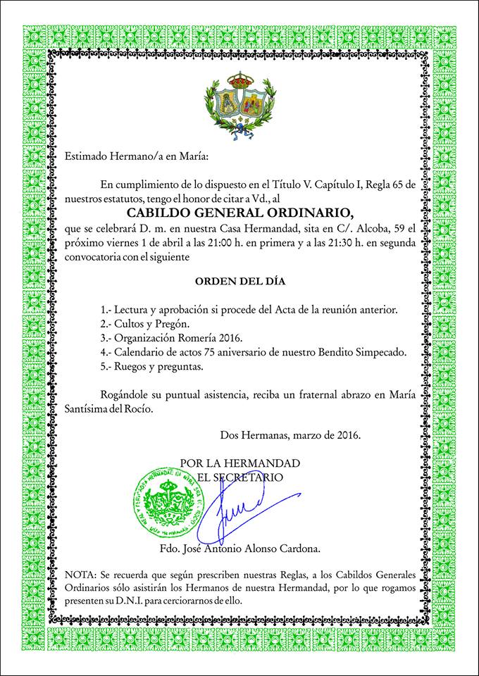 La Hermandad de Dos Hermanas cita a  Cabildo General Ordinario el próximo día 1 de abril de 2016.