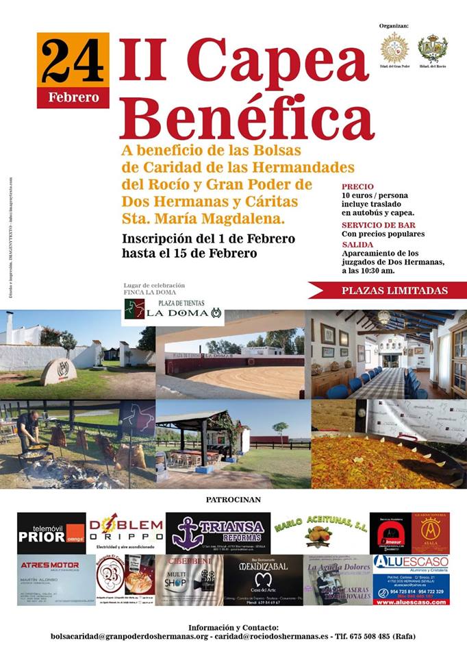 El próximo 24 de febrero se celebrará una Capea a beneficio de las Bolsas de Caridad de las Hermandades del Rocío, el Gran Poder y Cáritas de Santa María Magdalena. El lugar dónde se desarrollará esta capea será en la plaza de tientas de La Doma, ubicada en la Autovía Sevilla-Madrid, salida 524. El precio será de 10 euros por persona que incluye traslado en autobús y poder participar en la capea ya sea como espectador o para salir al ruedo. Habrá servicio de bar con precios populares.