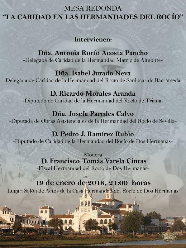 El viernes día 19 de Enero, a las 21 horas, se celebrará en el salon de actos de la Casa-Hermandad, una mesa redonda bajo el título “La Caridad en las Hermandades del Rocío” en la que intervendrán: