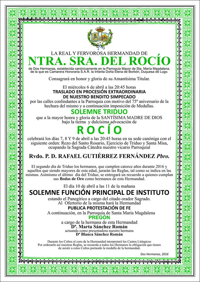 La Hermandad de Dos Hermanas celebra Solemne Triduo los días 7,8 y 9 de abril de 2016 y Pregón el día 10 de abril a cargo de Marta Sánchez Román.