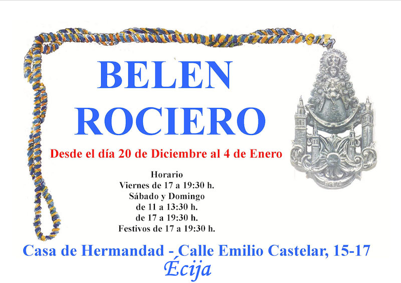 Horario del Belén Rociero que hemos instalado en nuestra Casa de Hermandad, así como del Rastrillo Benéfico para la Campaña de Navidad que desarrolla esta Hermandad de Écija para el próximo fin de semana.