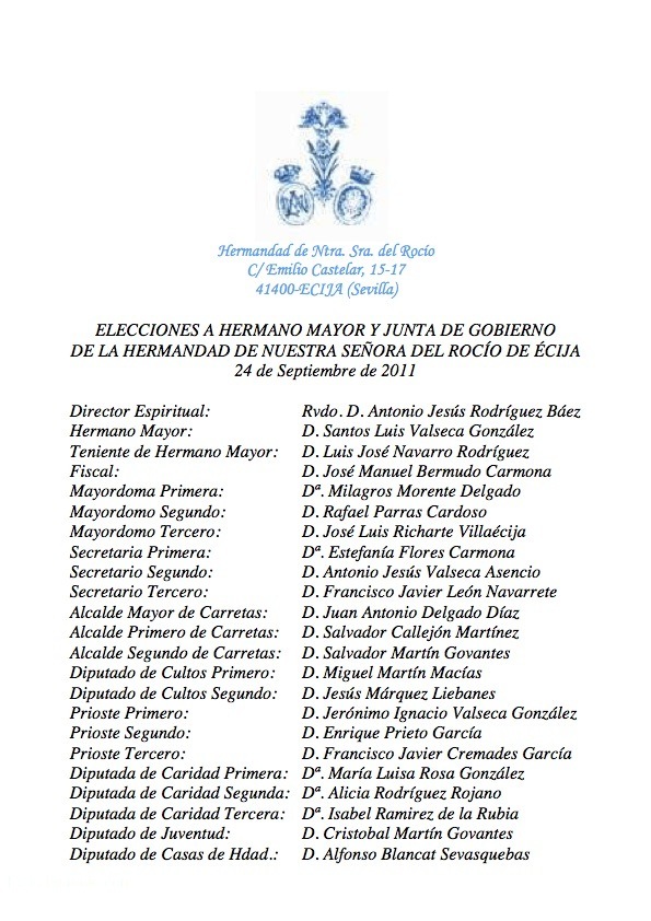 En las elecciones celebradas el pasado sábado día 24 de Septiembre, los hermanos de esta Hermandad de Ntra. Sra. del Rocío de Écija mostraron su apoyo a la única candidatura presentada, que es la que se adjunta.