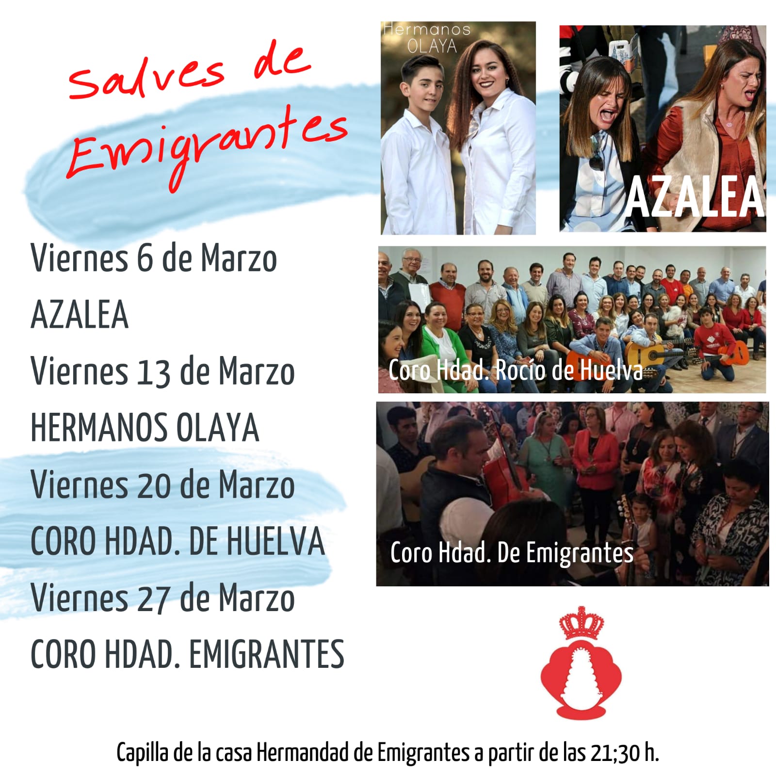 Los hermanos y devotos de la Hermandad de Emigrantes están llamados mañana viernes, a las 21.00 horas, a la tradicional Eucaristía del primer viernes, que será oficiada por el director espiritual de la entidad rociera José Manuel Barral, que contará con la intervención musical del coro de la hermandad.