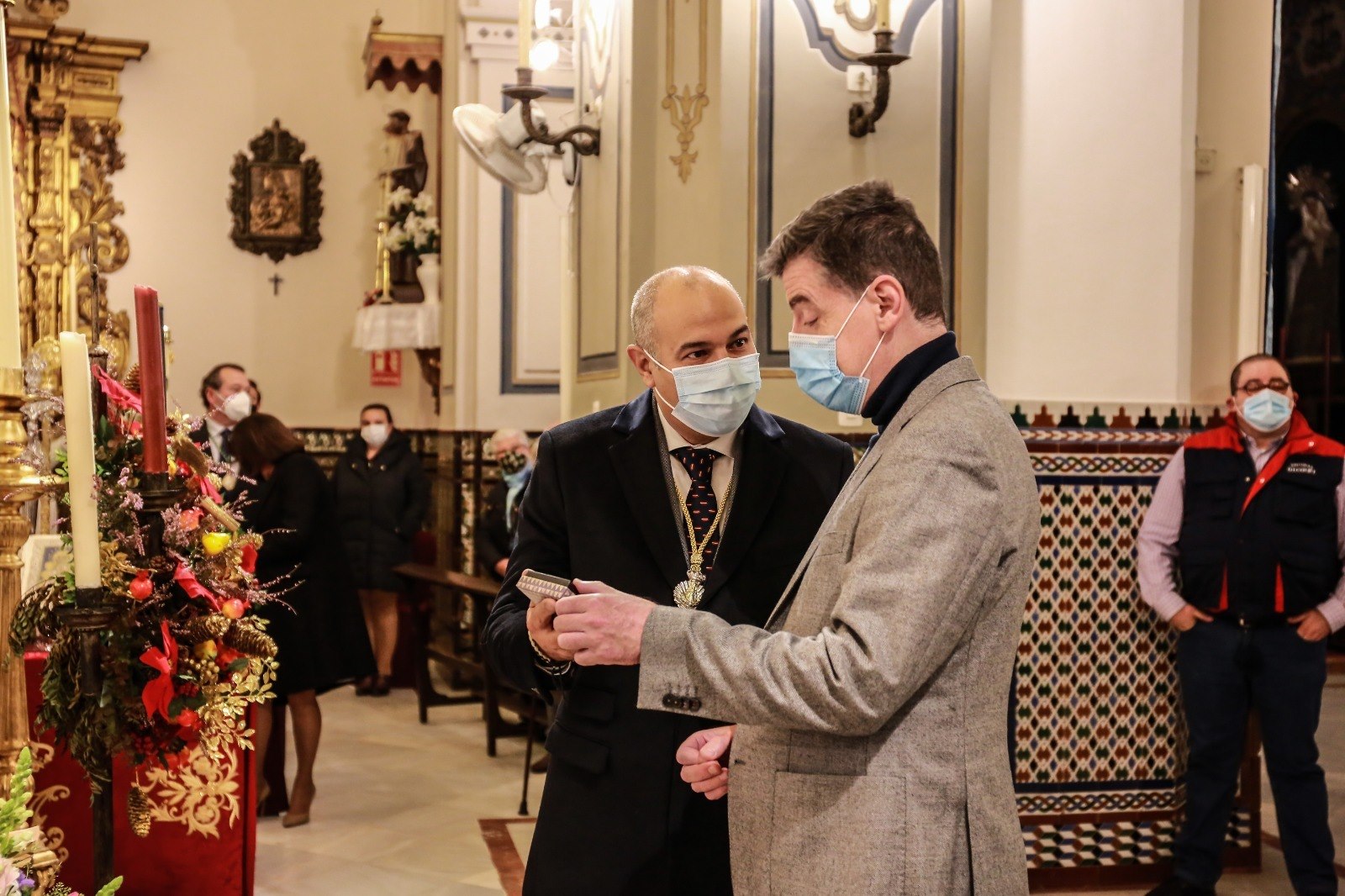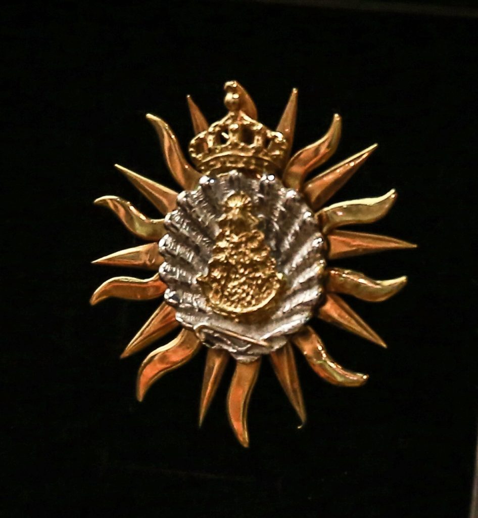 Como agradecimiento a la Hdad. Matriz de Almonte por el bello gesto que han tenido con nuestra Hermandad, ofreciendo la posibilidad de entronizar su Belén en nuestra carreta de Plata, esta Junta de Gobierno, en nombre de todos sus hermanos de Emigrantes ha tenido a bien regalar un Broche para el Pastorcito, diseñado y realizado por José María Carrasco, hermano de nuestra Hdad., en el cual, centra nuestra concha de plata timbrada con corona Real, de ella y de manera circundante aparecen rayos rectos y flagrantes en dos alturas a modo de estrella.
