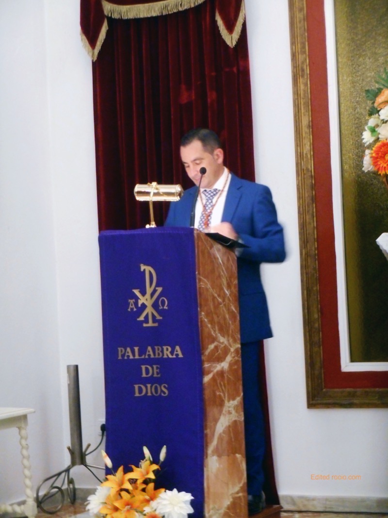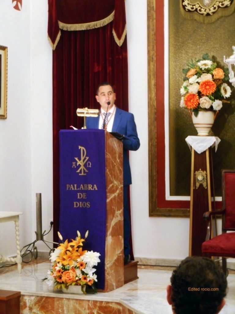 Decía el exaltador “la hermandad de las flores, como así la llaman muchos en tiempos de peregrinaciones, la hermandad de los carros adornados con flores de papel, herencia de nuestros queridísimos Cristóbal Fernández, maestro de maestro. Emigrantes también es reconocida por su seriedad y saber estar. De ello daba buena cuenta nuestro queridísimo Eduardo Fernández Jurado, pregonero, abanderado, presidente y un largo etcétera. Como nuestro alma máter en el mundo de las sevillanas, creador de infinidad de letras dedicadas a la hermandad de sus amores, nuestro eterno maestro del arte de la música Joseli Carrión y qué decir de Juan Gil Zamora, uno de nuestros fundadores y reconocido hombre de fe y amor a nuestra Madre, y así podríamos estar toda la noche recordando a nuestros viejos rocieros.
