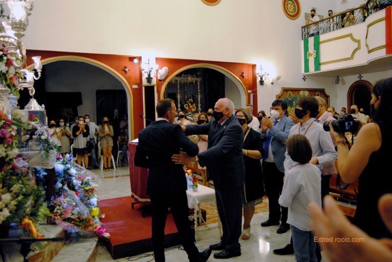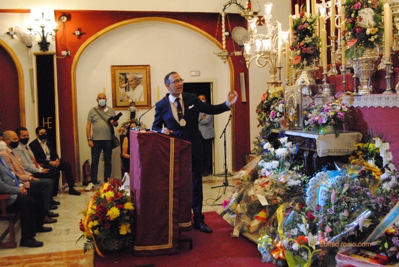 Y finalizaría su alocución manifestando; “y al llegar las camaristas, el pueblo entero te reza, lloran al ver tu carita, tu descomunal belleza. Vamos la Virgen ‘parriba’, vamos al cielo con Ella. Acercarla hasta esa esquina, donde toda Huelva la espera. Almonteño déjame que yo contigo la lleve, ayudarte con mi fe en esa carga tan leve. Pétalos llueven del cielo, ya va llegando la hora de poder ver mi Simpecado cara cara a la Señora. Recuerdos del eucaliptal donde antes te esperaba, ya va quedándose atrás y más fuertes son las palmas, que se acerca paso a paso, que la Virgen viene y va, no es que llegue con retraso es que no puede andar más. Almonteños abrir hueco, dejar la Virgen llegar que todos los emigrantes juntos le puedan rezar la Salve de Barral. Nono prepara los vivas. Almonteño acercalá. Venga la Virgen ‘parriba’. ¡Viva la Madre de Dios, viva el Pastorcito Divino, viva Emigrantes, por siempre y la Virgen del Rocío!