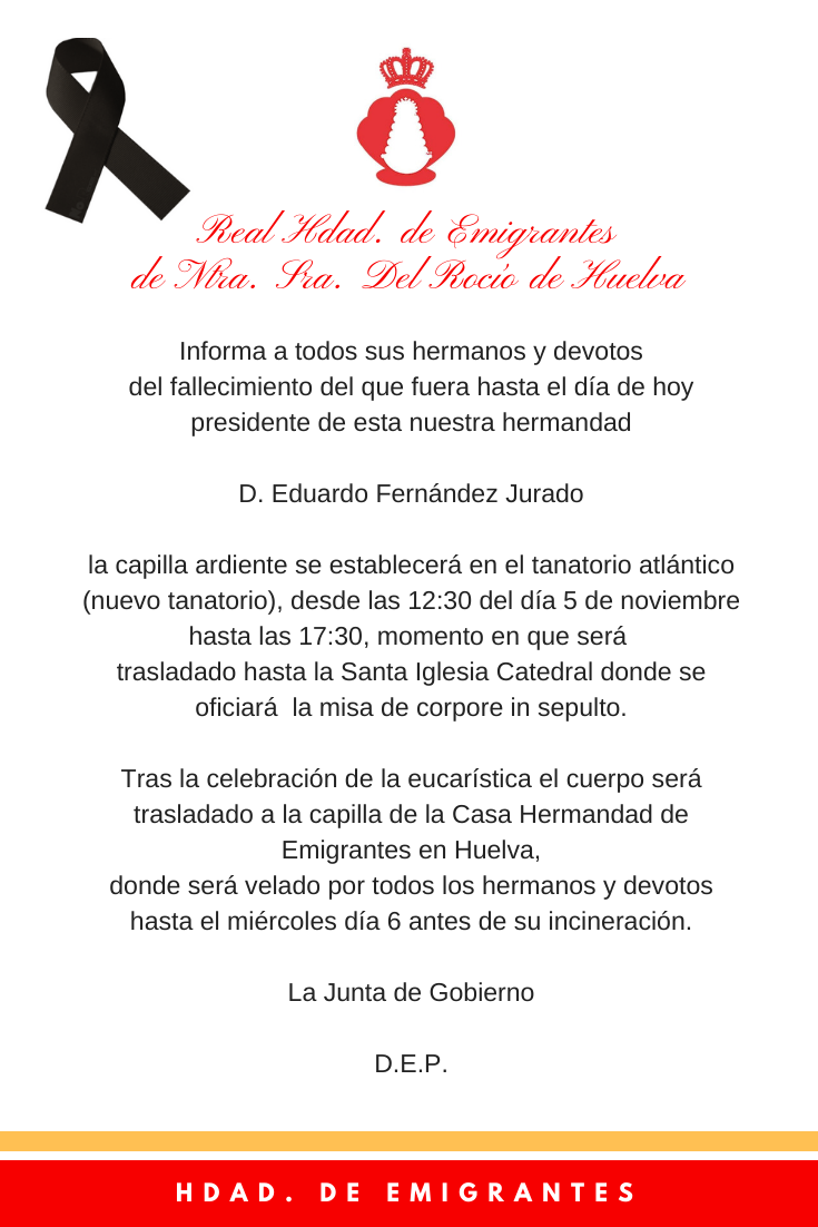 La Junta de Gobierno de la Hermandad de Emigrantes informa a todos los hermanos y devotos de esta Hermandad que nuestro Presidente D. Eduardo Fernández Jurado, ha fallecido. Rogamos una oracion por su eterno descanso.