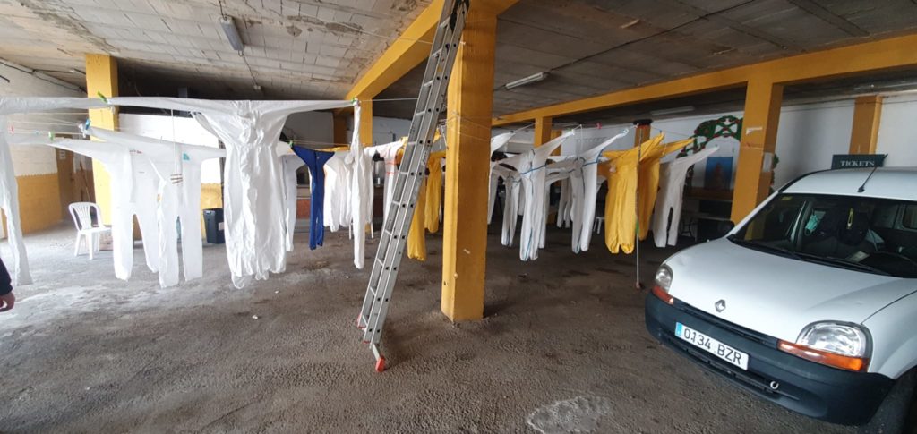 Desde finales de marzo, profesionales de los Distritos Sanitarios Huelva Costa-Condado Campiña realizan en las instalaciones de la casa de hermandad de Emigrantes labores de tratamiento y limpieza de EPIs que han contribuido a garantizar la seguridad y protección de nuestros profesionales sanitarios.