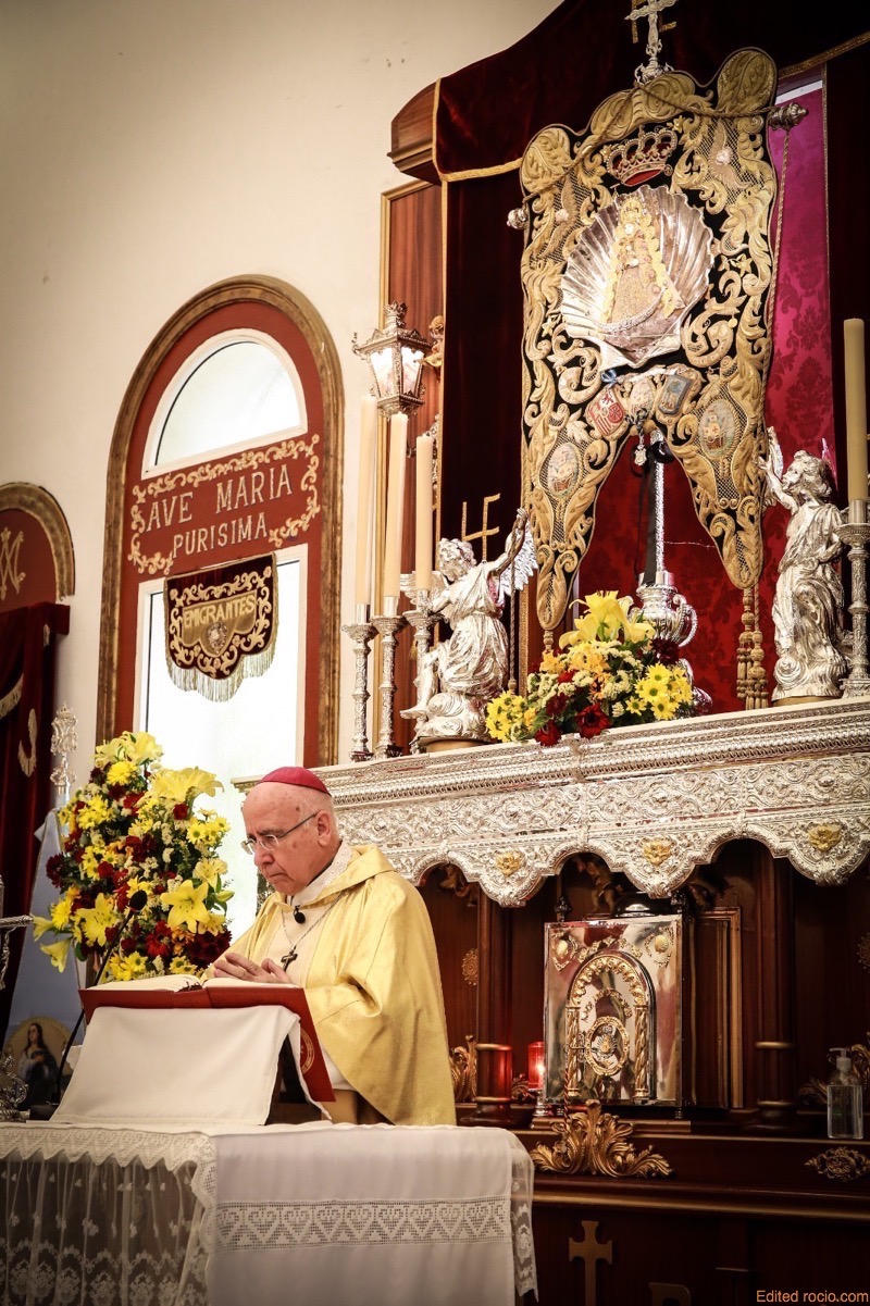 El prelado inició su homilía señalando “las singularidades de este Rocío debido a los tiempos que estamos viviendo debido a la pandemia que hace que reflexionemos mucho sobre el sentido de las cosas. La vida se nos interrumpe de alguna manera. No estáis como otros años preparando vuestras carretas, preparando todo el camino, pero es importante vivir las cosas”. Viaplana no olvidó los orígenes de Emigrantes en tierras alemanas, “donde los hermanos tuvieron que vivir muchos Rocíos sin poder ir a El Rocío. Ello le llevó a celebrar este a mucha distancia e incluso se atrevieron a fundar esta hermandad debido a su gran amor a la Virgen María”.